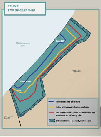 يشار إلى أنّ الخطة التي أعلن عنها رئيس الولايات المتحدة الأمريكية دونالد ترامب ورئيس وزراء الاحتلال الإسرائيلي بنيامين نتنياهو في 29 سبتمبر/أيلول، ووضعت دون مشاركة فلسطينية، تنص على انسحاب تدريجي على ثلاث مراحل، يُميّز كل منها بلون في الخريطة المرفقة: