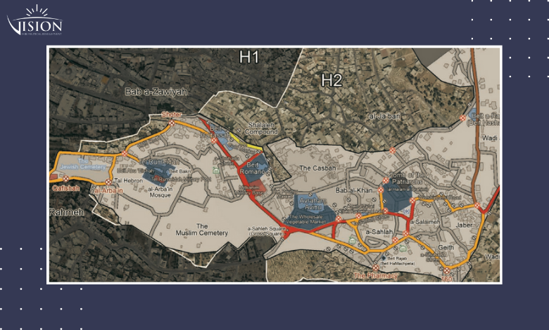 [1] بموجب بروتوكول الخليل عام 1997 قُسِّمت المدينة إلى منطقتين: H1 التي خضعت لولاية السلطة الفلسطينية أمنيًا ومدنيًا على نحو مماثل لبقية مدن الضفة، وH2 التي تشمل البلدة القديمة ومحيط الحرم الإبراهيمي وبقيت تحت السيطرة الأمنية الإسرائيلية مع نقل الصلاحيات المدنية الخاصة بالفلسطينيين إلى السلطة. داخل H2 تتموضع خمس بؤر/أحياء استيطانية هي: بيت هداسا، بيت رومانو، تلّ الرميدة، أفراهام أفينو، وبيت الرجبي، بينما تقع بقية المستوطنات في محافظة الخليل ضمن المناطق المصنّفة C وفق اتفاق أوسلو. (المصدر: مركز رؤية للتنمية السياسية).