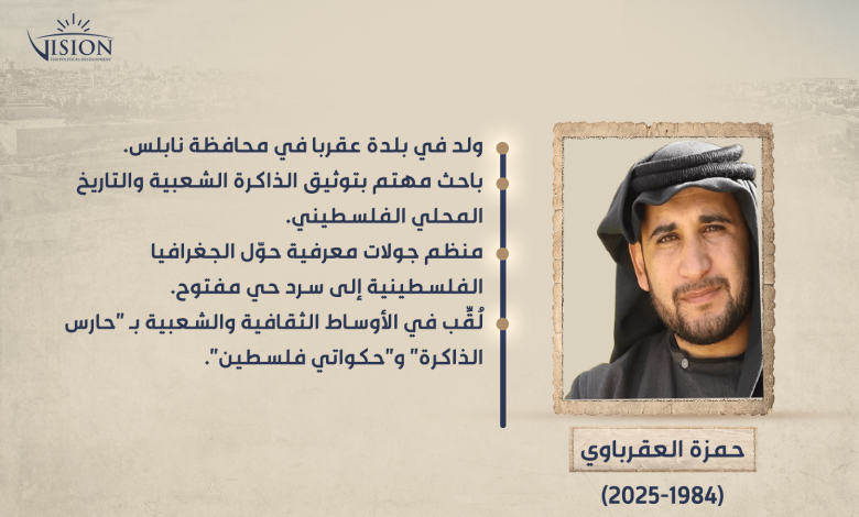 انطلق العقرباوي في عمله من منهجية تجمع بين البحث الميداني الدؤوب والسرد الحكائي الواعي، مع إصرار على إعادة الاعتبار للذاكرة الشفوية بوصفها مصدرًا معرفيًا أصيلًا، لا مجرد مخزون للحكايات أو النوستالجيا. وشارك عام 2012 في ترميم عدد من المقامات في بلدته، في إطار مساعٍ للحفاظ على المعالم الدينية والتراثية من الاندثار، وإلى جانب ذلك، عمل بشكل تطوعي واسع مع عدد من المؤسسات المحلية، مسهمًا في أنشطة ثقافية واجتماعية متعددة، وقدَّم عروضًا محلِّية في البلدات والقرى والمدارس والنوادي الفلسطينية، وشارك في مهرجانات عربية في تونس ومصر وقطر والمغرب وغيرها.