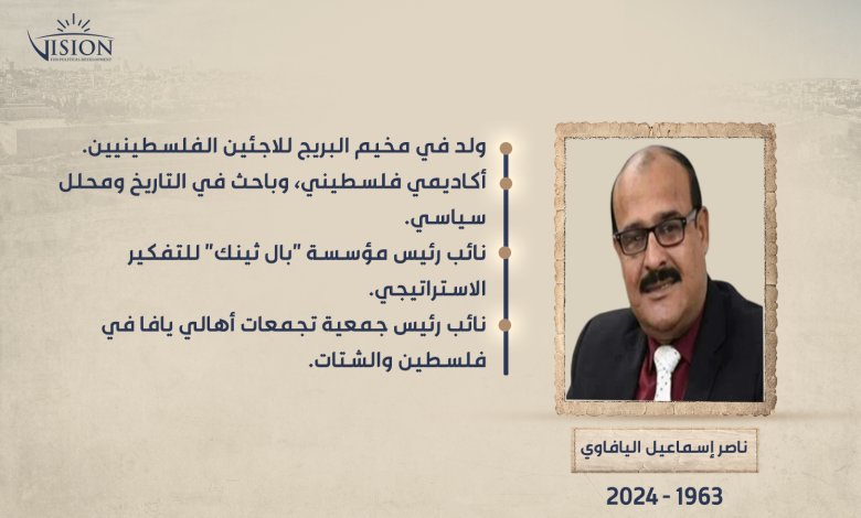 وُلد ناصر إسماعيل اليافاوي في مخيم البريج للاجئين الفلسطينيين وسط قطاع غزة في الأول من كانون الثاني/ يناير عام 1963، لعائلة فلسطينية لاجئة تعود أصولها إلى مدينة يافا المحتلة. نال درجة البكالوريوس في التاريخ من جامعة بيرزيت، ودرجة الماجستير في التاريخ من جامعة الأقصى، ودرجة الدكتوراه في التاريخ من إحدى الجامعات المغربية.