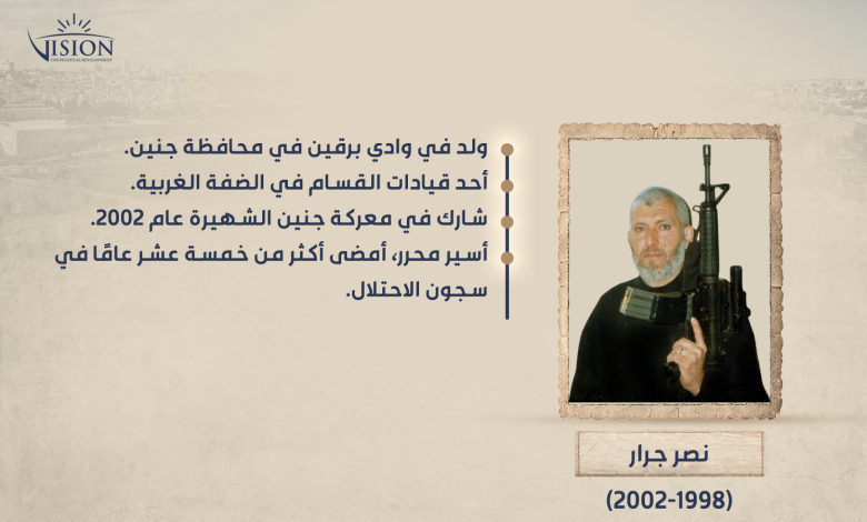 ولد نصر خالد إبراهيم جرار في منطقة وادي برقين في محافظة جنين في الأول من كانون الثاني/ يناير 1958، وهو متزوج وله ثلاثة أولاد وبنت. درس المرحلتين الأساسية والثانوية في مدارس جنين. عمل موظفًا في لجنة زكاة جنين قسم رعاية الأيتام والمسنين.