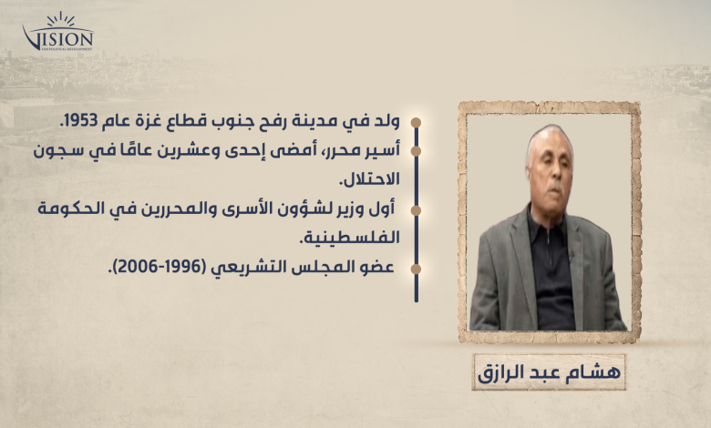 وُلد هشام علي حسن عبد الرازق في مدينة رفح جنوب قطاع غزة في الحادي عشر من آذار/ مارس عام 1953. انخرط في العمل الوطني في شبابه المبكر، وكان عنصرًا في خلية عسكرية تابعة لحركة فتح، حاولت تنفيذ عمليات عسكرية ضد أهداف تابعة للاحتلال في الداخل المحتل عام 1948، كما كان من كوادر فتح داخل سجون الاحتلال، وقد خاض عدة إضرابات عن الطعام.
