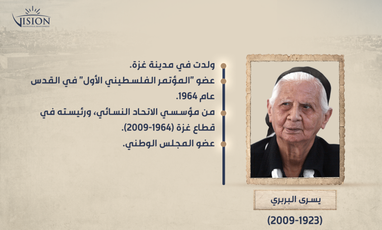 شاركت يسرى البربري مع حيدر عبد الشافي وإبراهيم أبو ستة، في أول وفد فلسطيني زار هيئة الأمم المتحدة سنة 1963، وكانت عضوًا في “المؤتمر الفلسطيني الأول” في القدس في أيار/ مايو 1964، الذي تمخض عنه تأسيس “منظمة التحرير الفلسطينية”، شاركت في تأسيس “الاتحاد النسائي” في غزة سنة 1964، أصبحت رئيسة له، ثم ترأست وفد نساء قطاع غزة إلى المؤتمر التأسيسي لـ “الاتحاد العام للمرأة الفلسطينية” الذي عُقد في القدس سنة 1965، وأصبحت عضوًا في المجلس الوطني، وشاركت في تقديم المساعدات لعائلات المعتقلين بعد احتلال القطاع من قبل الاحتلال، وكانت عضوًا في مجلس إدارة “جمعية المحاربين القدماء”، وفي مجلس إدارة “جمعية المعاقين” في قطاع غزة.